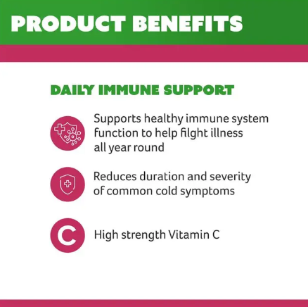 This chewable tablet helps support healthy immune system function, relieve the severity and duration of common cold symptoms, support collagen formation, aid minor wound healing, and act as an antioxidant to reduce free radicals—all in one convenient daily chew.