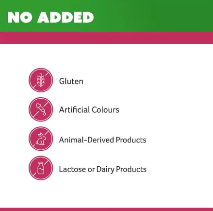 Contains: No added gluten, lactose, artificial colours, dairy products, or animal-derived products. Does not contain real fruit.