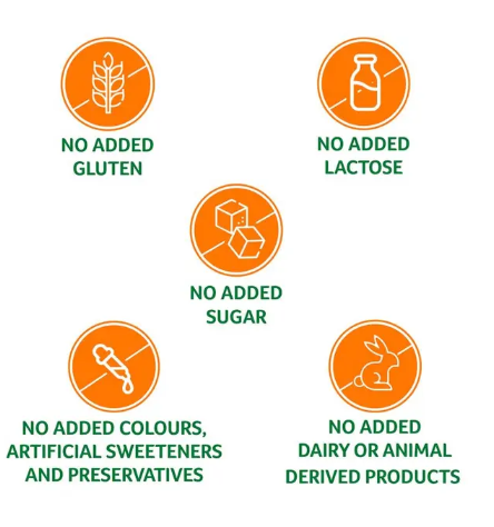 No Added: Gluten, lactose, sugar, artificial colours, flavours, sweeteners, or dairy products