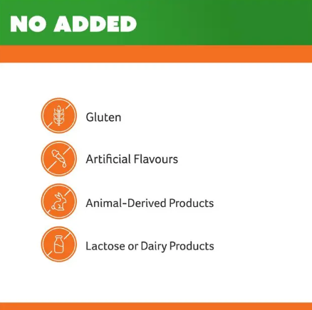 No Added: Gluten, lactose, artificial flavours, dairy products, or animal-derived products*