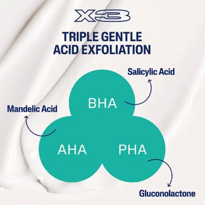 Gentle Daily Exfoliation: A triple acid blend of Salicylic Acid, Mandelic Acid, and Gluconolactone helps remove dead skin cells without disrupting the skin barrier