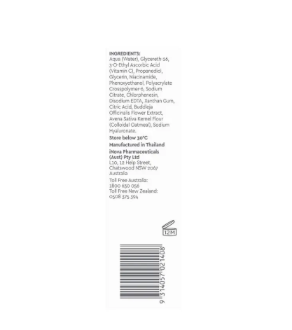 Aqua (Water), Glycereth-26, 3-O-Ethyl Ascorbic Acid (Vitamin C), Propanediol, Glycerin, Niacinamide, Phenoxyethanol, Polyacrylate Crosspolymer-6, Sodium Citrate, Chlorphenesin, Disodium EDTA, Xanthan Gum, Citric Acid, Buddleja officinalis Flower Extract, Avena sativa Kernel Flour (Colloidal Oatmeal), Sodium Hyaluronate.