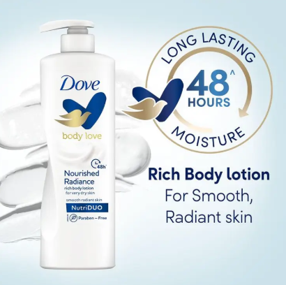 Dove Supple Bounce Body Lotion penetrates up to 10 layers** deep into the skin’s surface to nourish from within. Its unique formulation delivers 48 hours of long-lasting moisturisation, leaving your skin soft, supple, and radiant. Enriched with Dove’s signature NutriDUO blend of natural skin nutrients and essential oils, this rich body lotion provides deep hydration with a quick-absorbing, non-greasy feel—perfect for everyday use.