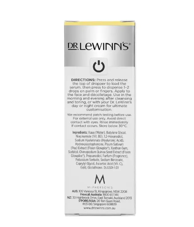 Press and release the dropper to load the serum, then dispense 1–2 drops onto your palm or fingertips. Gently apply to the face and décolletage. Use morning and evening after cleansing and toning, or layer with your Dr. LeWinn's day or night cream for a customised routine.