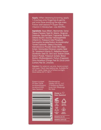 After cleansing and toning, apply 3–4 pumps onto your fingertips and gently pat onto the face, avoiding the eye area. Follow with essano™ Super Glow Vitamin C Moisturiser. Use morning and evening for best results.
