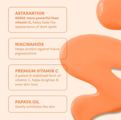 Aqua (Water), Niacinamide, Carica Papaya (Pawpaw) Seed Oil, Betaine, Dicaprylyl Carbonate, Caprylic/Capric Triglyceride, Glycerin, Cetearyl Alcohol, Ascorbyl Tetraisopalmitate (Vitamin C), Potassium Cetyl Phosphate, Hydroxyethyl Acrylate/Sodium Acryloyldimethyl Taurate Copolymer, Cetearyl Glucoside, Haematococcus Pluvialis (Green Microalga) Extract, Simmondsia Chinensis (Jojoba) Seed Oil, Tocopherol (Vitamin E), Helianthus Annuus (Sunflower) Seed Oil, Citric Acid, Sodium Citrate, Sodium Phytate, Potassium Sorbate, Benzyl Alcohol, Ethylhexylglycerin, Parfum, Citrus Aurantium (Orange) Peel Oil, Citrus Limon (Lemon) Peel Oil, Limonene.