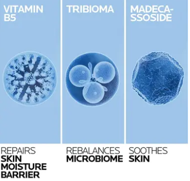 Tribioma: Prebiotic complex of sugars, plant, and fermented extracts that help balance skin pH, strengthen the moisture barrier, and protect against environmental aggressors.