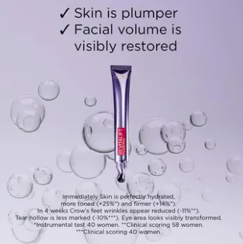 L’Oréal Paris® Revitalift Filler [HA] Replumping Eye Cream is enriched with concentrated Hyaluronic Acid to deeply hydrate, fill lines, and re-plump skin around the eyes.