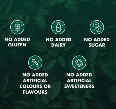 No added gluten, lactose, sugar, artificial colours, artificial flavours, artificial sweeteners, artificial preservatives, dairy products, or animal-derived products