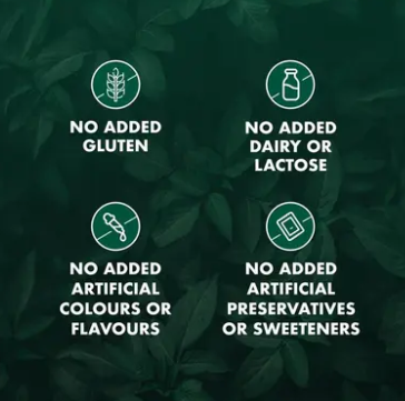 Clean Formula: No added gluten, lactose, dairy, artificial colours, flavours, sweeteners, or preservatives.