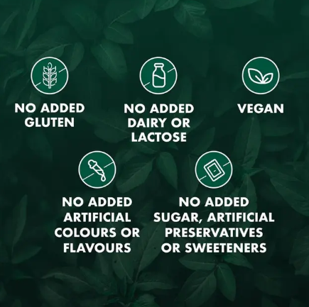 Contains: No added gluten, lactose, sugar, artificial colours, artificial flavours, artificial sweeteners, artificial preservatives, dairy products, or animal-derived products.