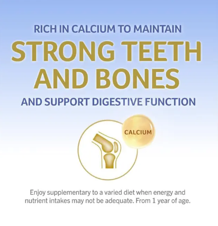 Milk solids, maltodextrin, vegetable oils, minerals (calcium citrate, calcium phosphate, sodium phosphate, ferrous sulphate, magnesium chloride, zinc sulphate, potassium iodide), emulsifier (soy lecithin), vitamins [sodium ascorbate (vitamin C), dl-α-tocopheryl acetate (vitamin E), niacinamide (niacin), pyridoxine hydrochloride (vitamin B6), riboflavin (vitamin B2), thiamin mononitrate (vitamin B1), retinyl acetate (vitamin A), folic acid, cholecalciferol (vitamin D3), cyanocobalamin (vitamin B12)], Limosilactobacillus reuteri culture (DSM 17938 under license from BioGaia AB), antioxidants (mixed tocopherols concentrate, ascorbyl palmitate), acidity regulator (citric acid).