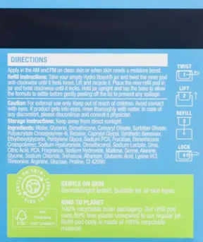 Your favourite water gel is now refillable. This convenient refill pod fits perfectly into the Neutrogena® Hydro Boost® Hyaluronic Acid Water Gel jar. Simply twist, lift, and refill to help reduce plastic waste by 89% compared to buying a new jar.