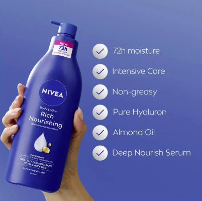 Improved Formula – Give your dry skin the care it deserves with NIVEA Rich Nourishing Body Lotion. Clinically proven to provide 72 hours of deep moisture, this nourishing body lotion leaves skin visibly soft, smooth, and healthy-looking with every use.
