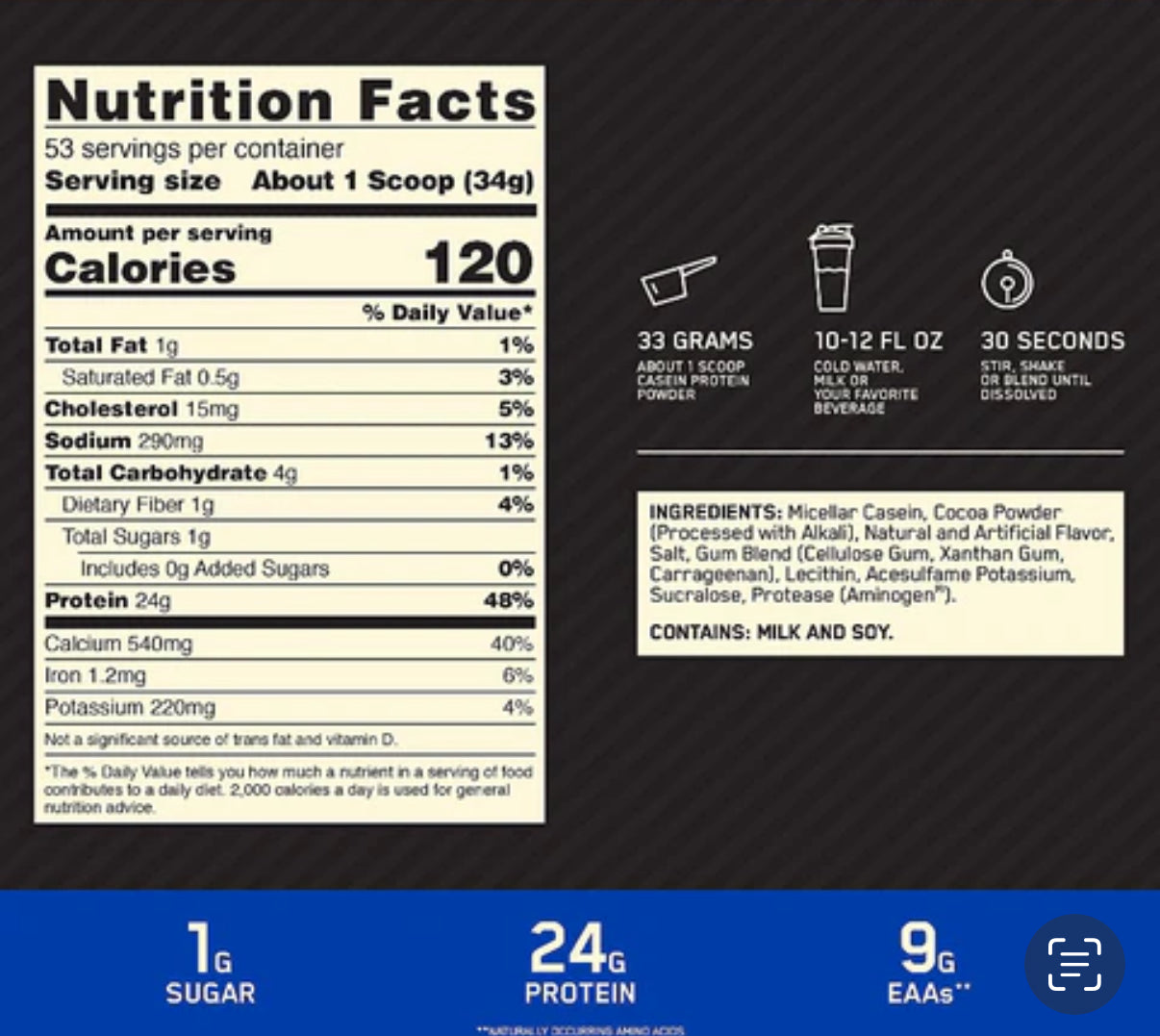 - Add 1 heaping scoop of Gold Standard 100% Casein™ to your shaker cup and then pour in 295mL-354mL of your preferred beverage.