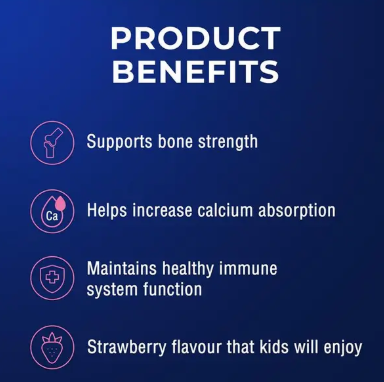 Vitamin D3 plays an essential role in bone mineralisation, calcium absorption, and muscle function, helping to maintain strong bones, teeth, and overall growth. It also helps maintain Vitamin D levels within the normal range and supports a healthy immune system in infants and children.