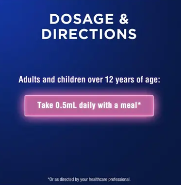 Directions for Use: Adults and children 12 years and over – take 0.5mL daily with a meal, or as directed by your healthcare professional.