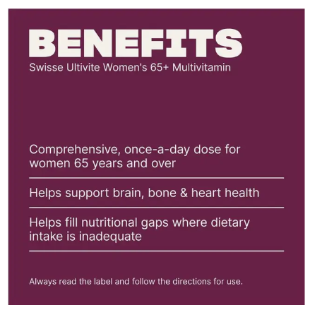Celebrate vitality in your golden years with Swisse Ultivite Women’s 65+ Multivitamin, a premium formula designed to support the unique health needs of women aged 65 and over. This comprehensive blend of vitamins, minerals, and herbs helps maintain energy, bone health, immunity, vision, and cognitive function.